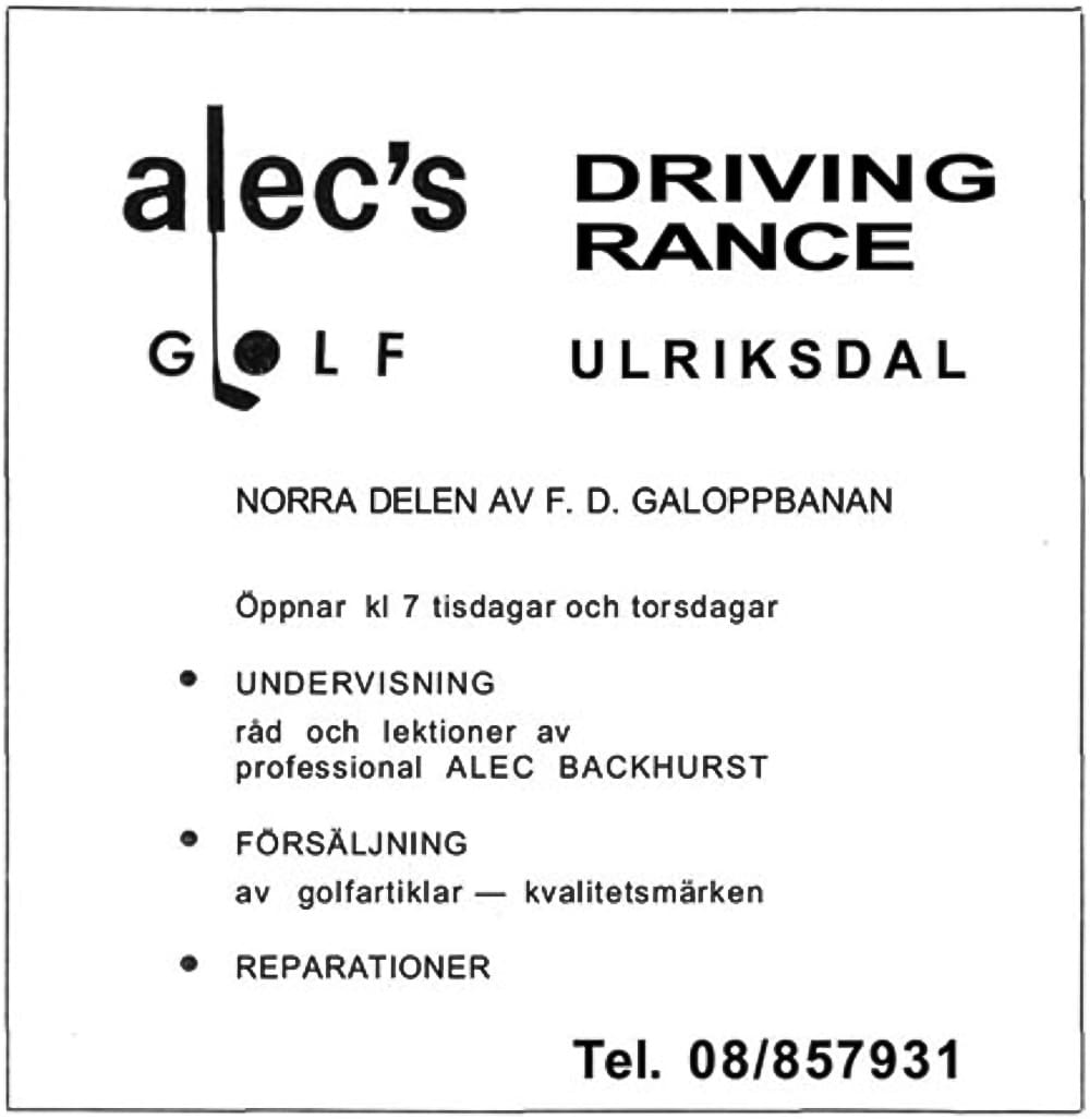 Alec Backhurst, som har drivit en populär golfskola i Ulriksdal sedan 1969, har beslutat att sälja sin anläggning och flytta till England med sin fru Elsa. Efter över 30 år i Skandinavien och en framgångsrik karriär inom golf, planerar de att köpa och driva ett pensionat i södra England. Alec, nu 53 år, känner att han inte längre har energi att driva anläggningen.