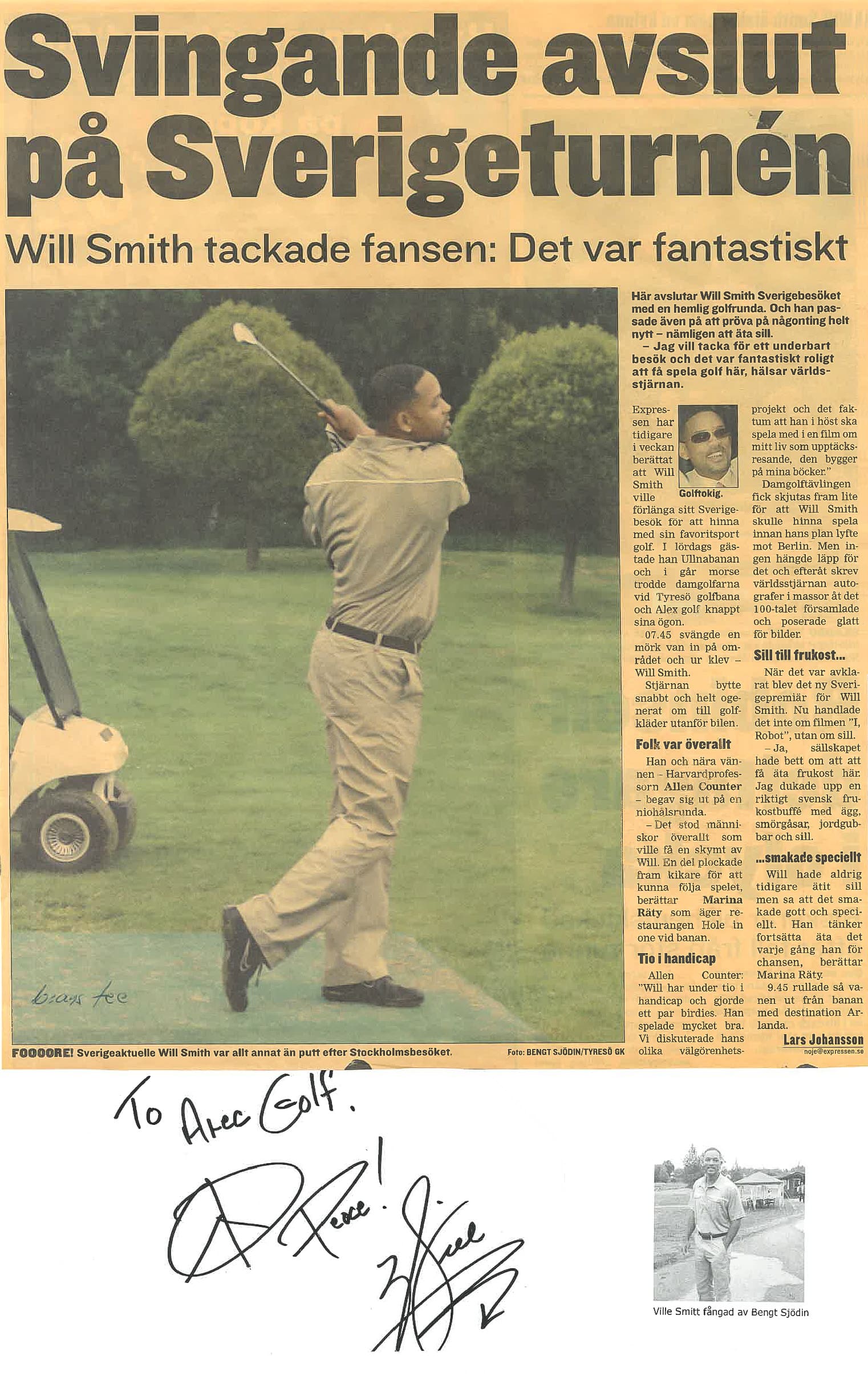 När Hollywoodstjärnan och artisten Will Smith besökte huvudstaden i samband med Sverigepremiären för sin film ”I, Robot” så passade han på att spela golf. Först blev det spel på exklusiva Europatourbanan Ullna och innan Will Smith flög vidare för PR-jobb i Berlin hann han med en niohålare på Tyresö GK.